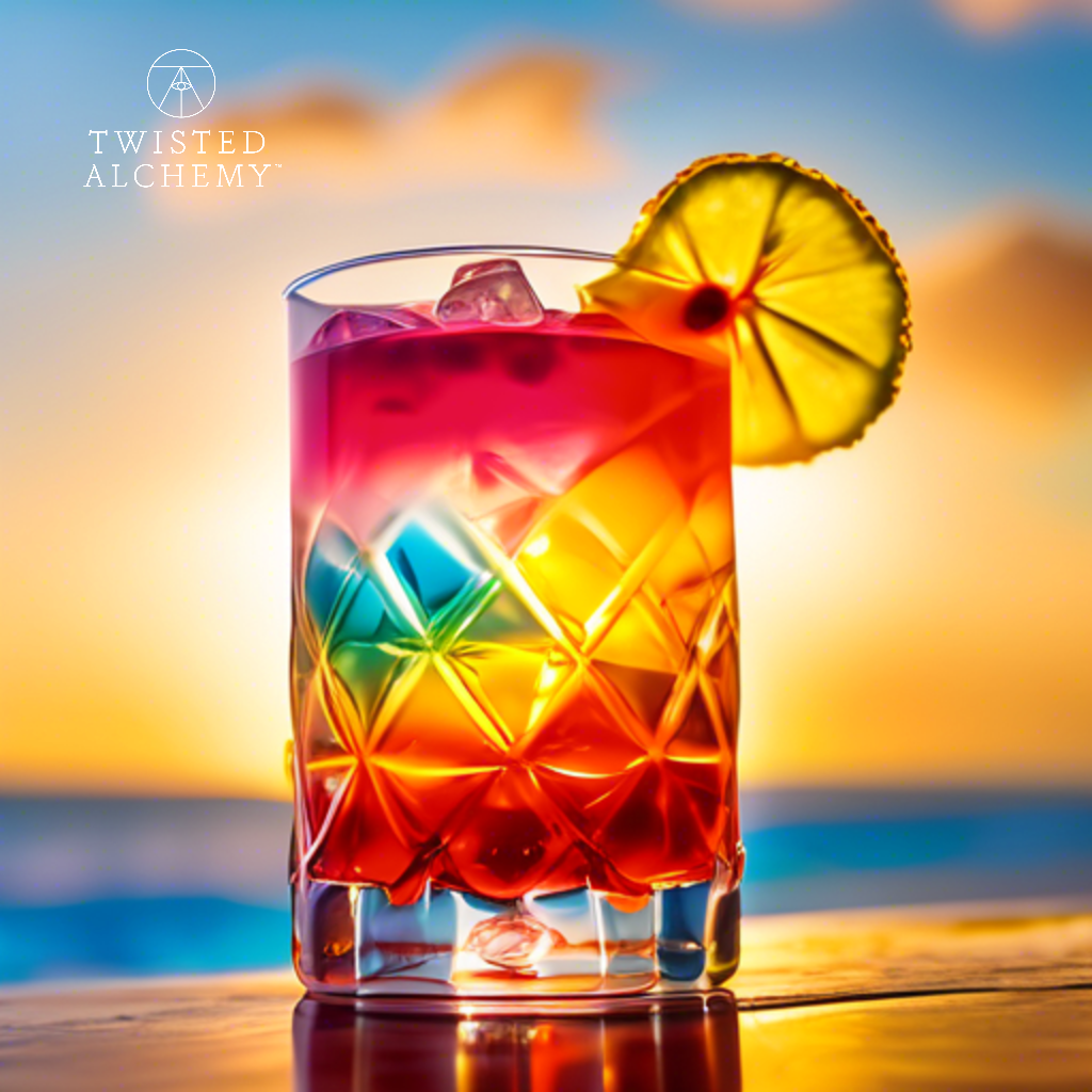 served in a highball glass, focusing on bright and vibrant hues with a refreshing zing. Experience a sunrise in a glass with this invigorating cocktail, where the richness of Demerara Syrup from Twisted Alchemy meets the vibrant mix of citrus flavors. Perfect for those who seek a refreshing and slightly sweet drink with a hint of complexity. Ingredients: - 2 oz Vodka - 1 oz Twisted Alchemy Demerara Syrup - 1 oz Blood Orange Juice - 1 oz Persian Lime Juice - 1 oz Club Soda - Dash of Orange Bitters Instructions: 1. Fill a highball glass with ice cubes. 2. Add vodka, Twisted Alchemy Demerara Syrup, blood orange juice, and Persian lime juice into a shaker with ice. 3. Shake well until the mixture is chilled. 4. Strain the mixture into the prepared highball glass over fresh ice. 5. Top with club soda and stir gently to combine. 6. Add a dash of orange bitters for depth. 7. Garnish with a thin slice of blood orange and a sprig of fresh mint for an aromatic touch. Enjoy this colorful and zesty cocktail as a tribute to the beauty of a sunrise, each sip offering a delightful balance of sweet, tart, and refreshing notes.